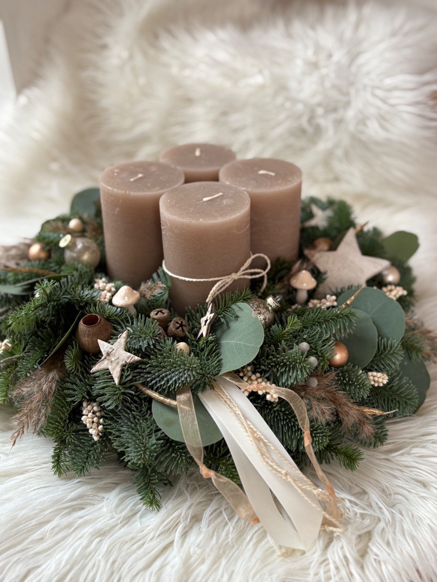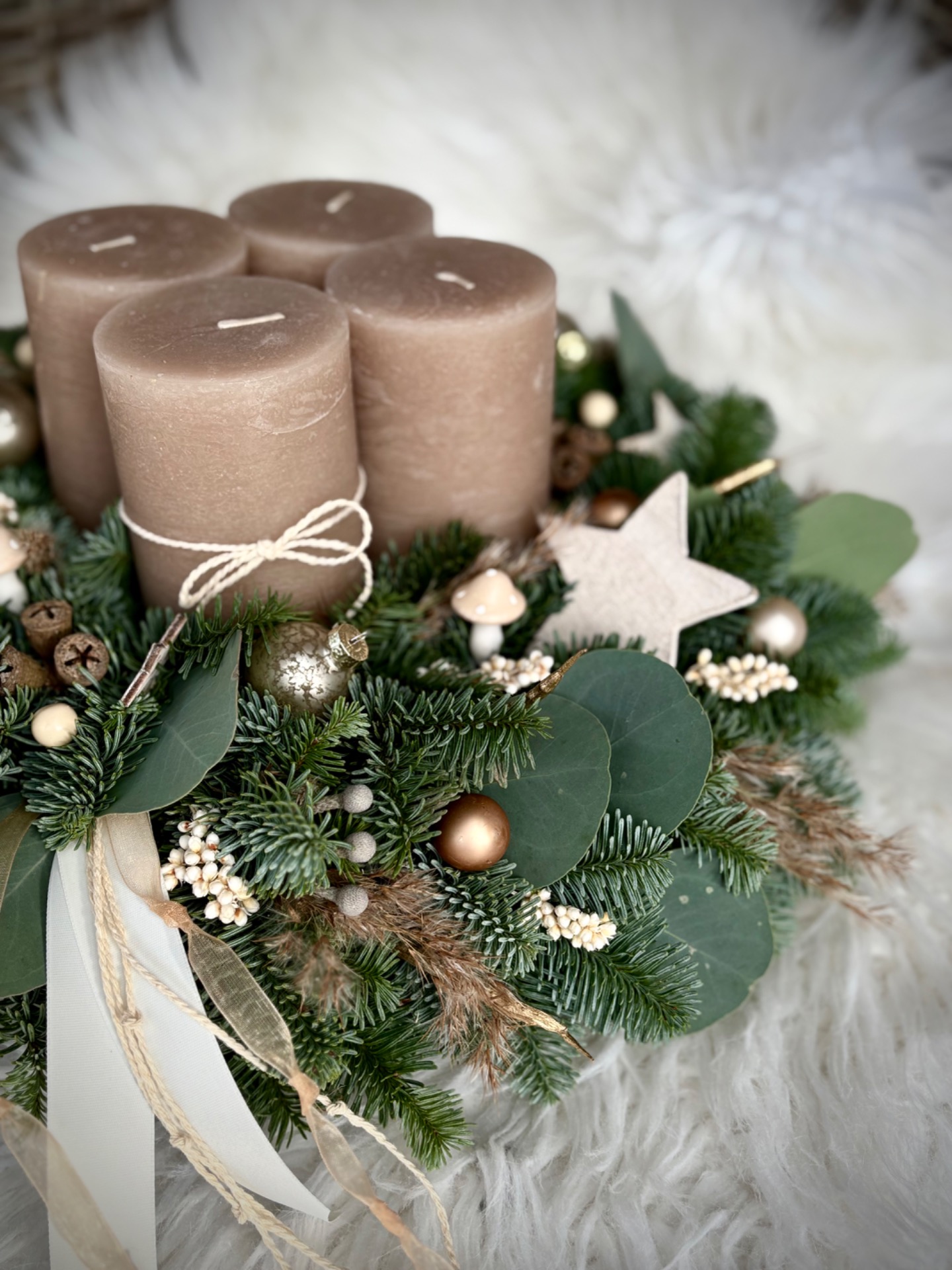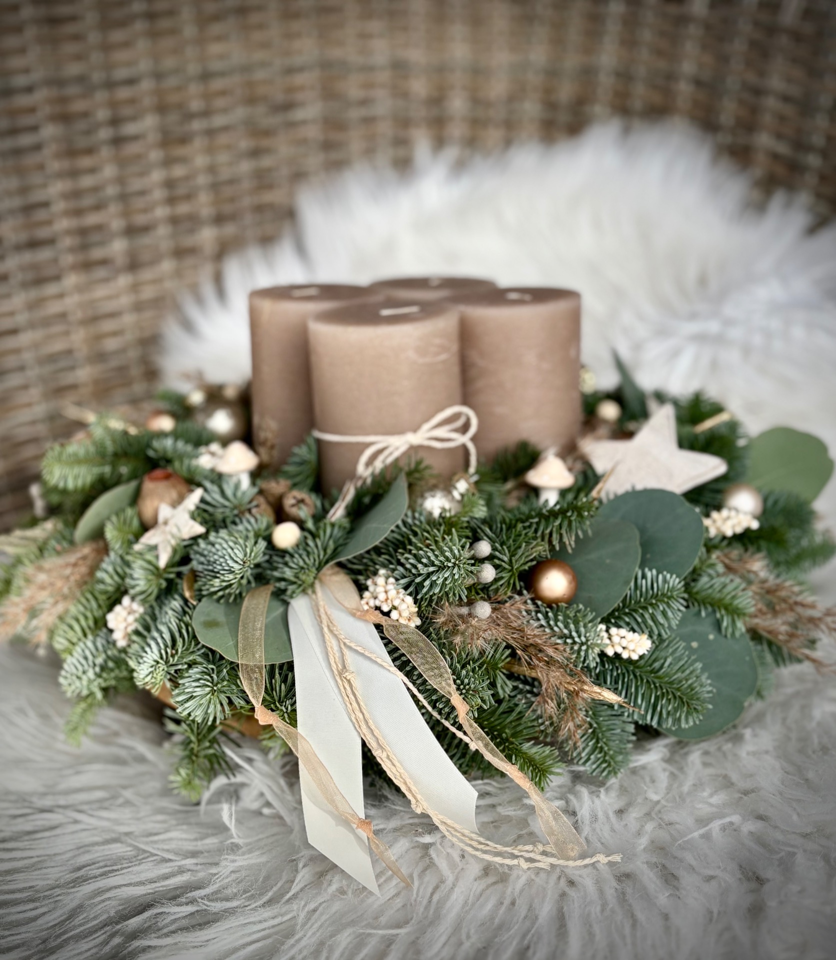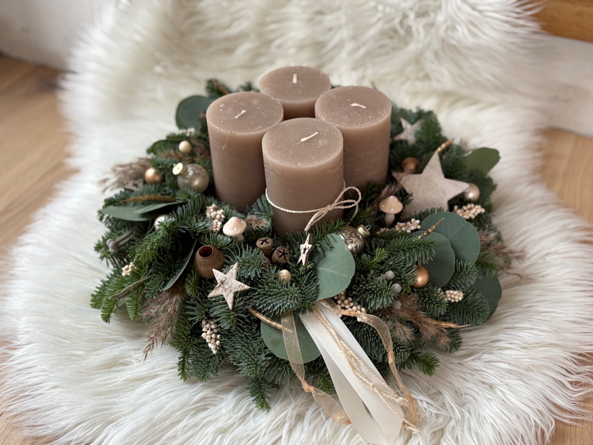 Věnec z neopadavé jedle Nobilis kombinovaný s eukalyptem. Ve středu se čtyřmi masivními rustikálními svíčkami. Doplněný je přírodninami, skleněnými baňkami, ozdobičkami ve tvaru stromečků a dalšími ozdobičkami. Vázaný na kvalitním slámovém korpusu.