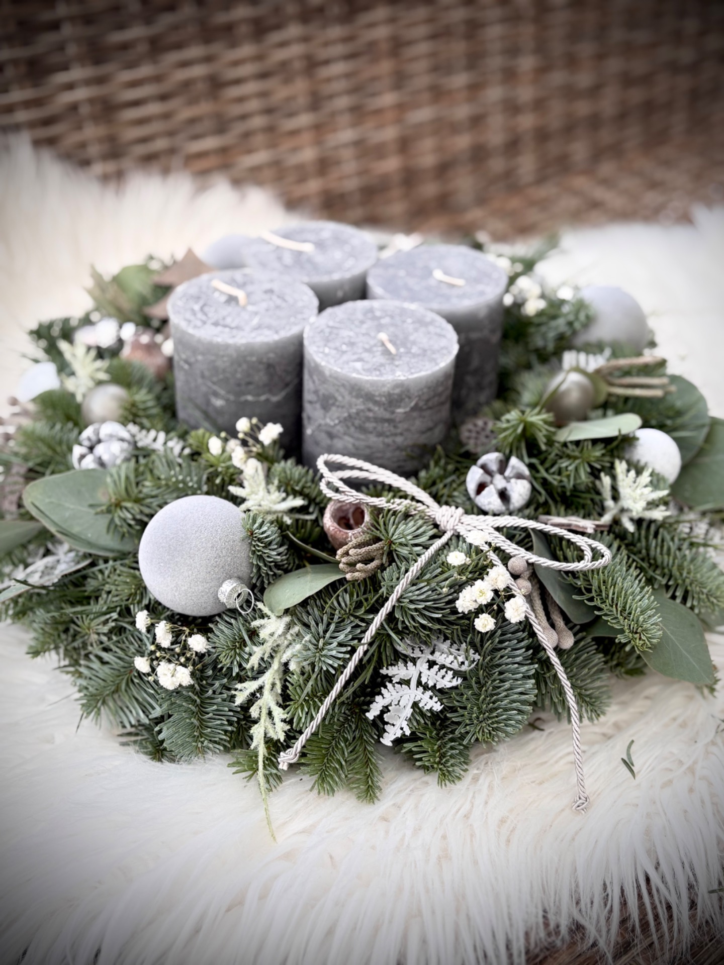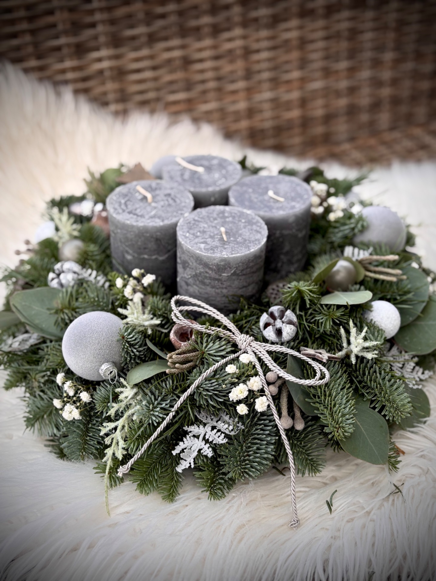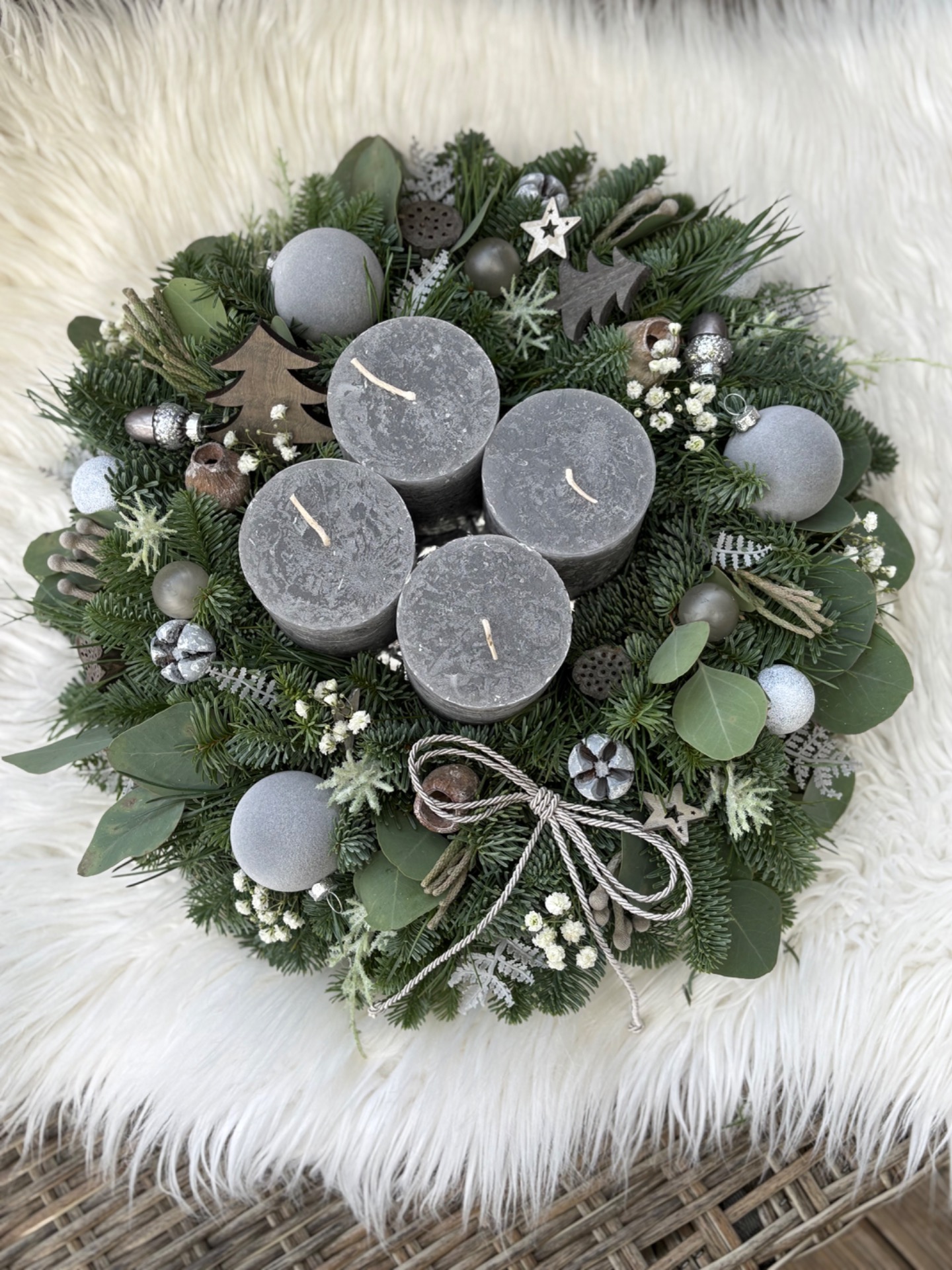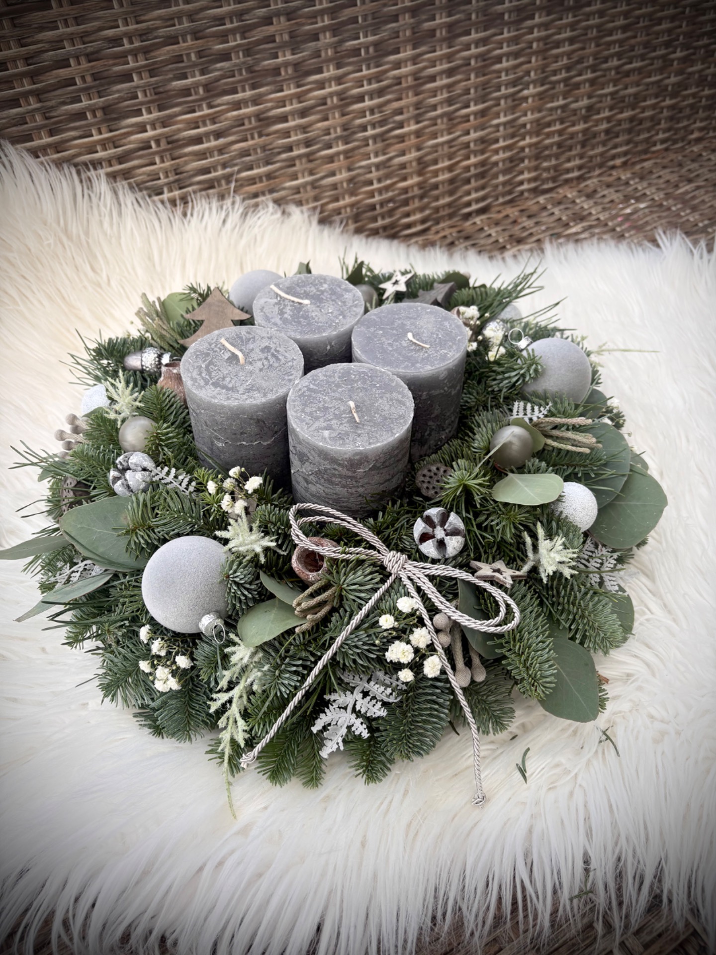 Věnec z neopadavé jedle Nobilis kombinovaný s eukalyptem. Ve středu se čtyřmi masivními rustikálními svíčkami. Doplněný je přírodninami, skleněnými baňkami a dalšími ozdobičkami. Vázaný na kvalitním slámovém korpusu.