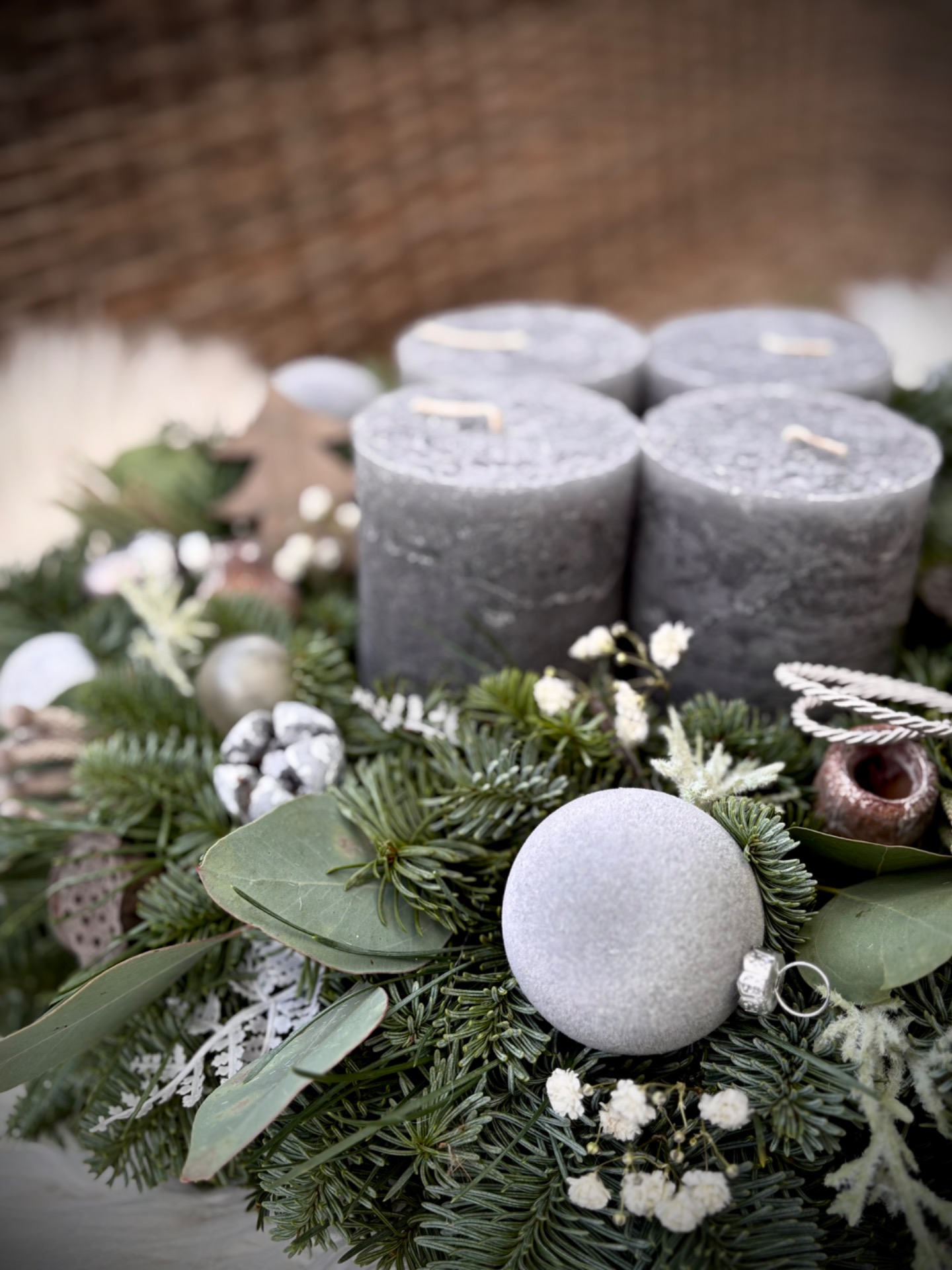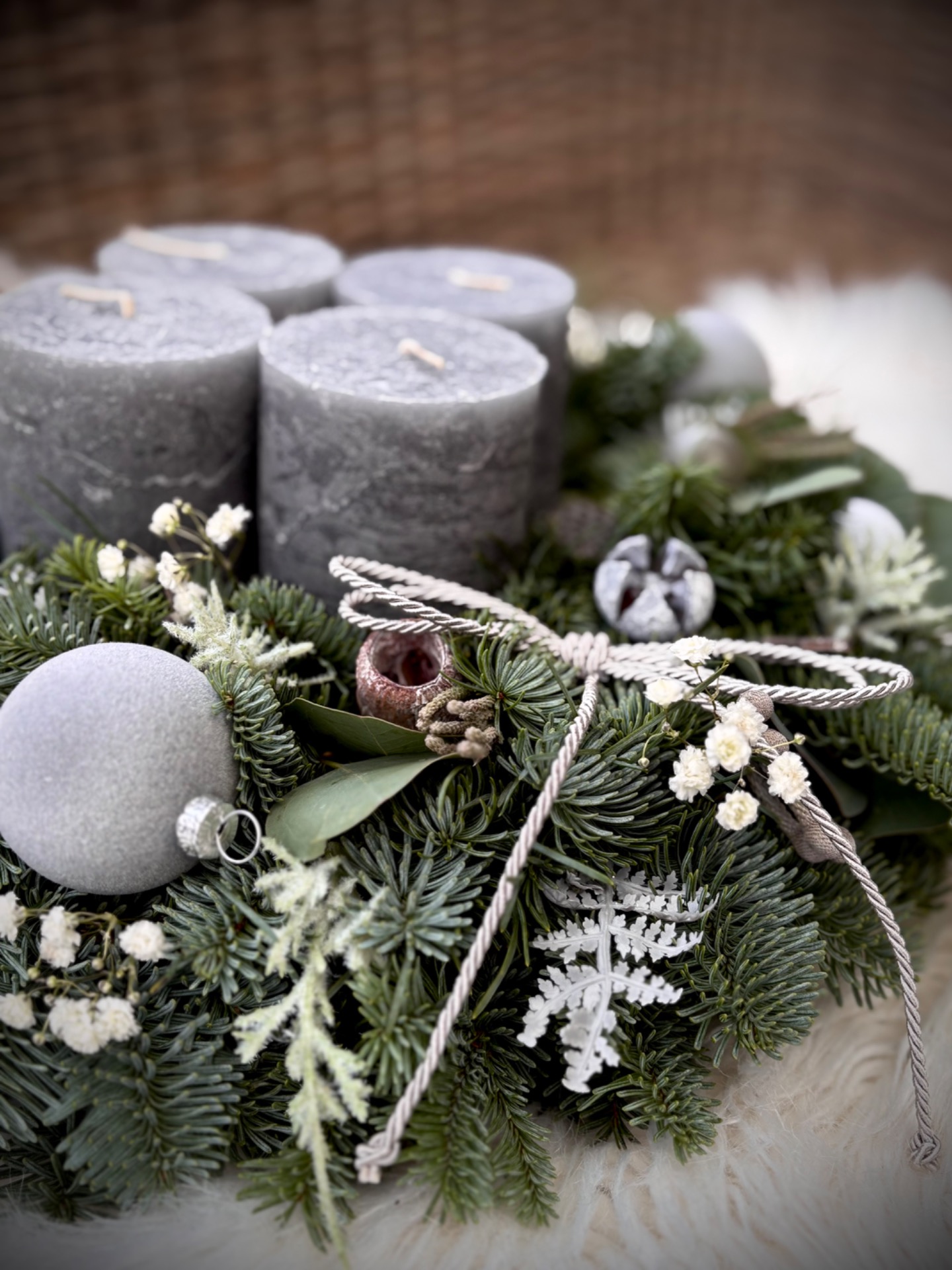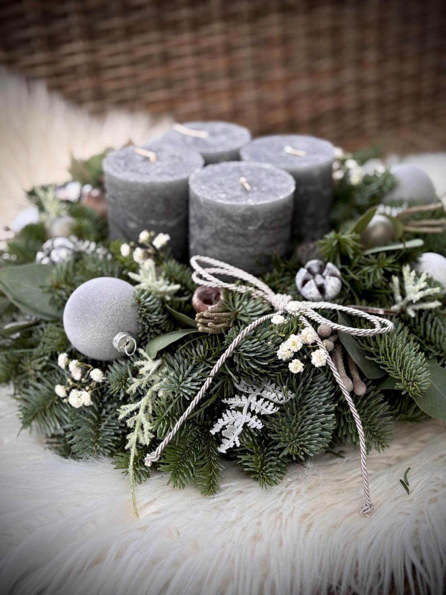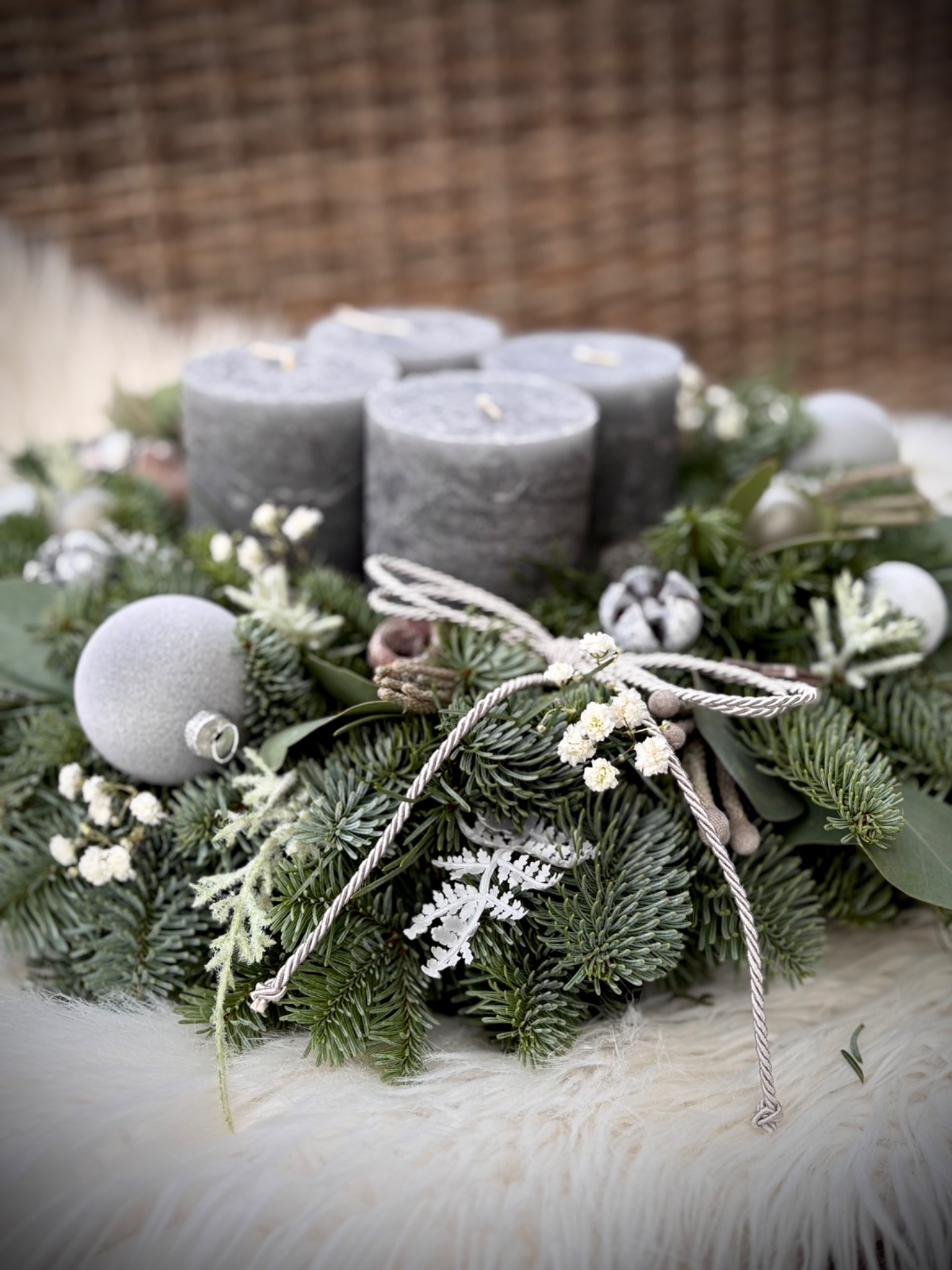 Věnec z neopadavé jedle Nobilis kombinovaný s eukalyptem. Ve středu se čtyřmi masivními rustikálními svíčkami. Doplněný je přírodninami, skleněnými baňkami a dalšími ozdobičkami. Vázaný na kvalitním slámovém korpusu.