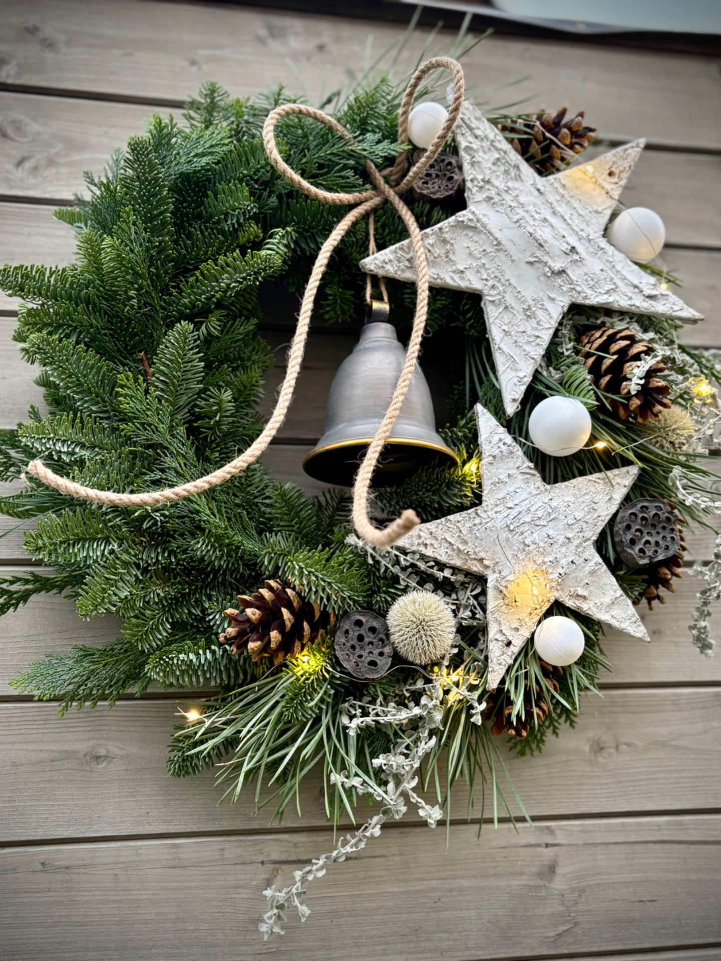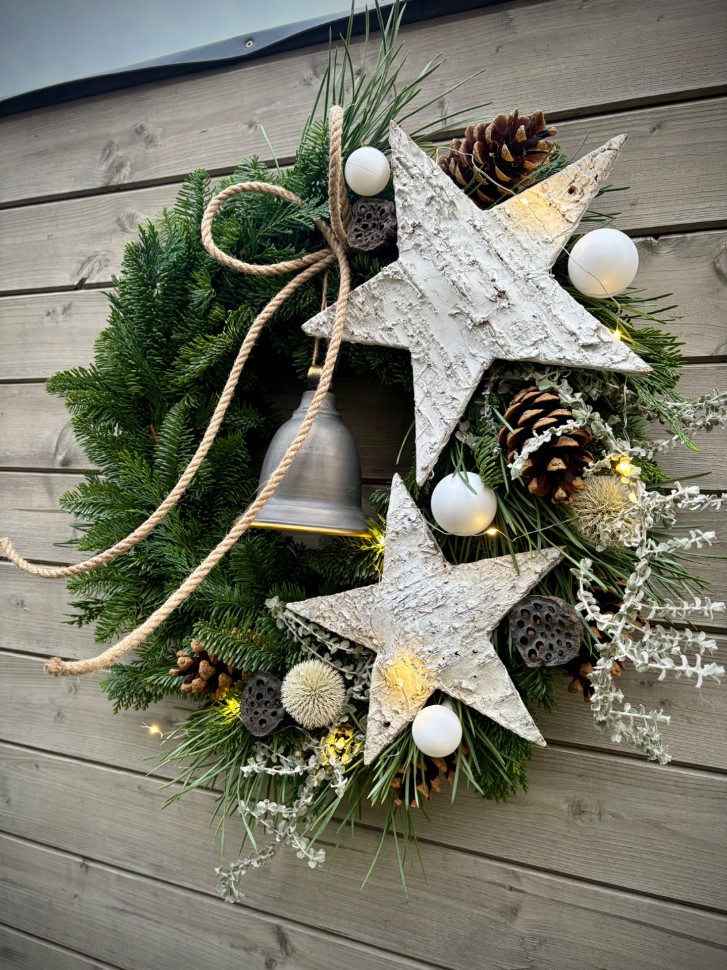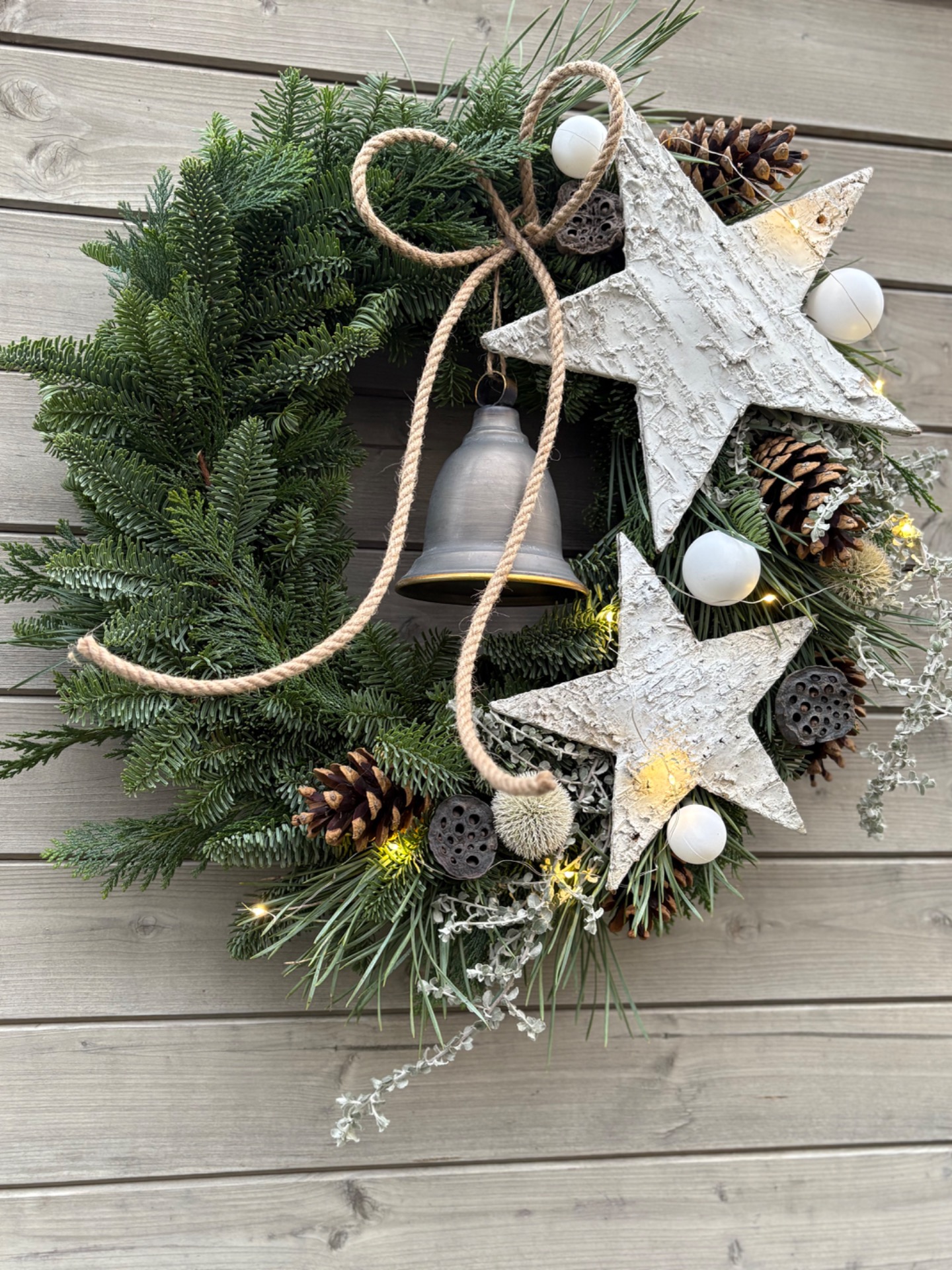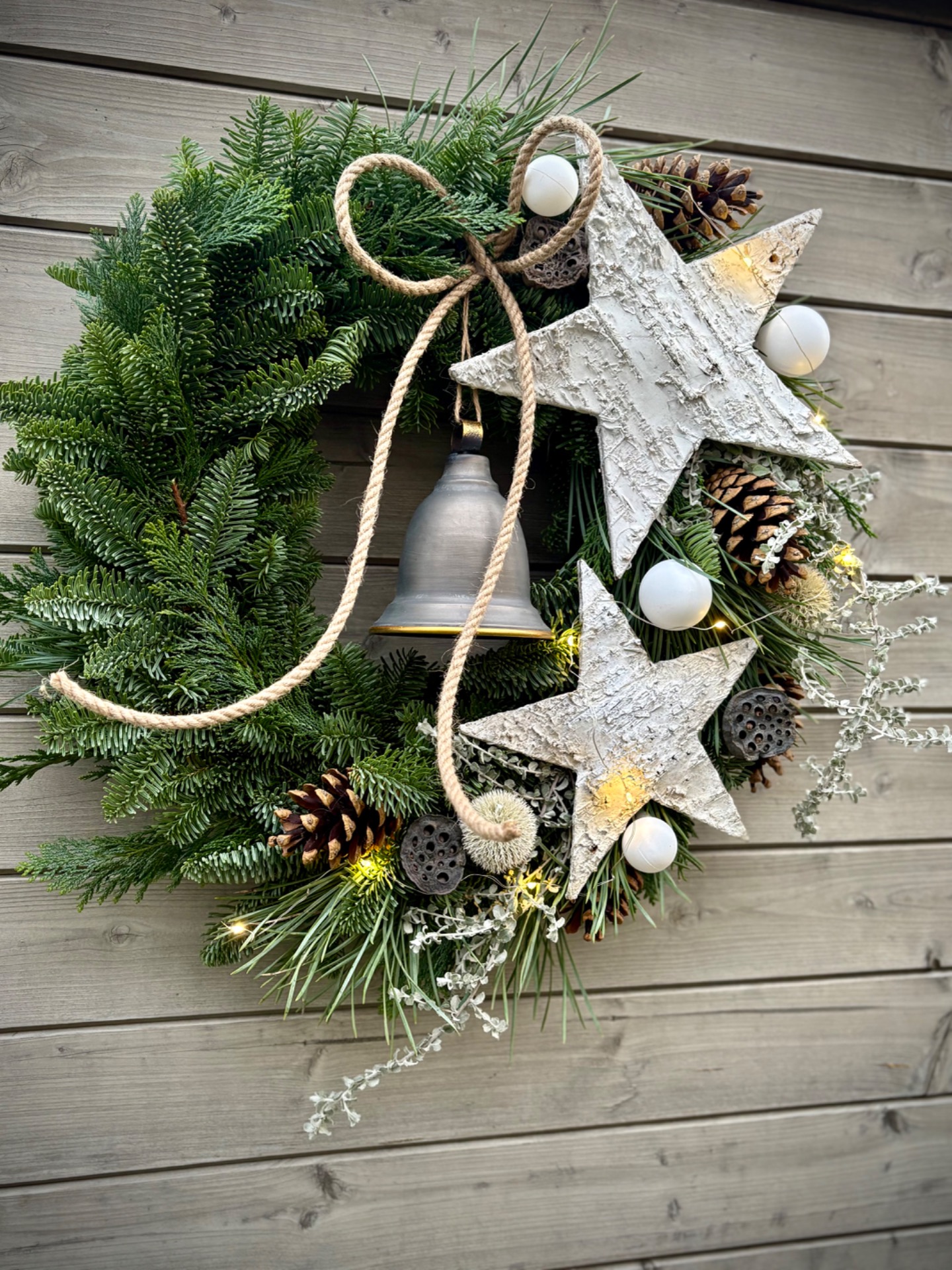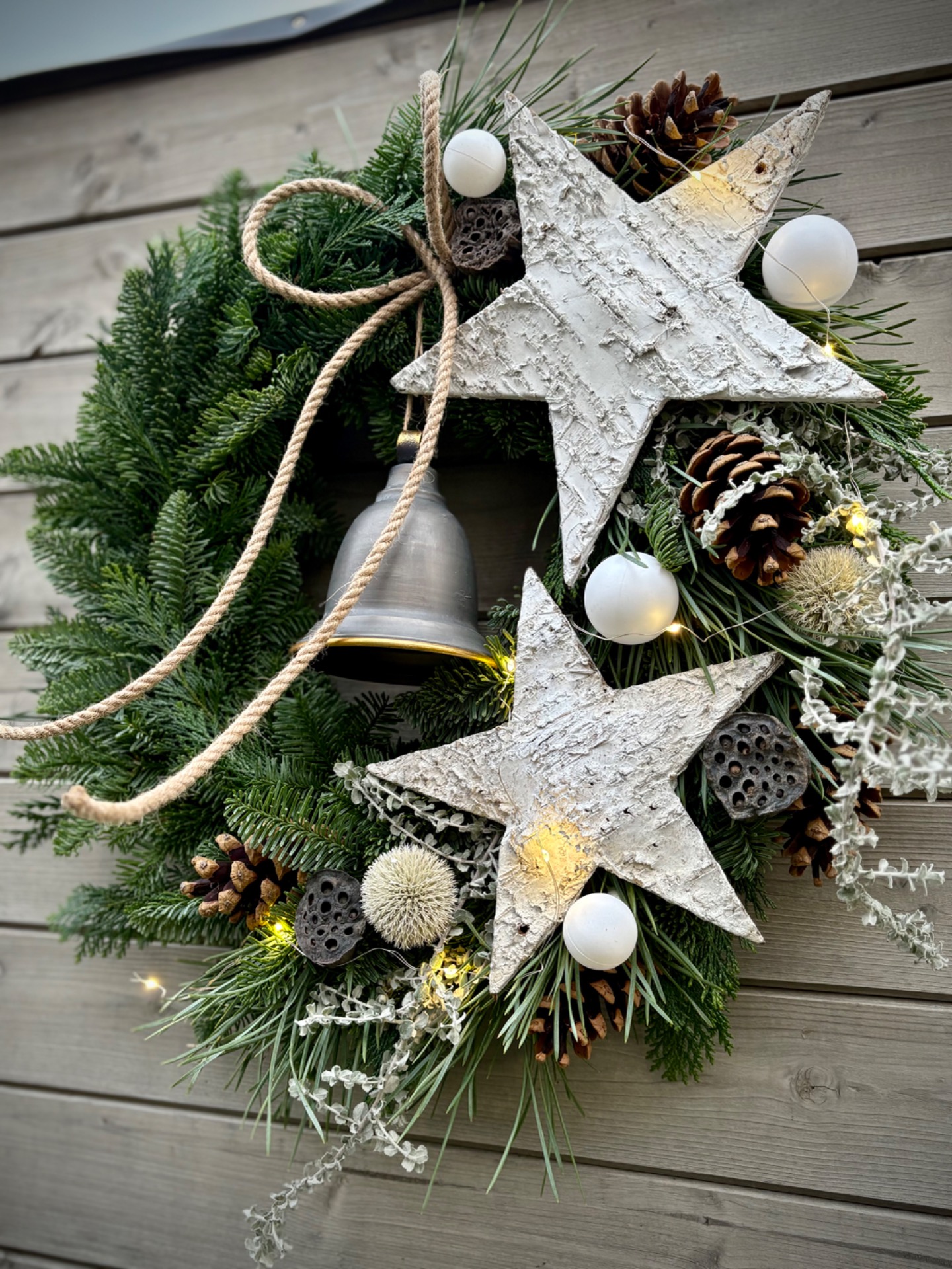 Ručně vázaný věnec z husté, neopadavé jedle Nobilis, který kombinuje přírodní šarm s jemně severským stylem. Dominantou jsou dvě velké strukturované hvězdy v bílo-šedých tónech a kovový zvon zavěšený na silném provazu.