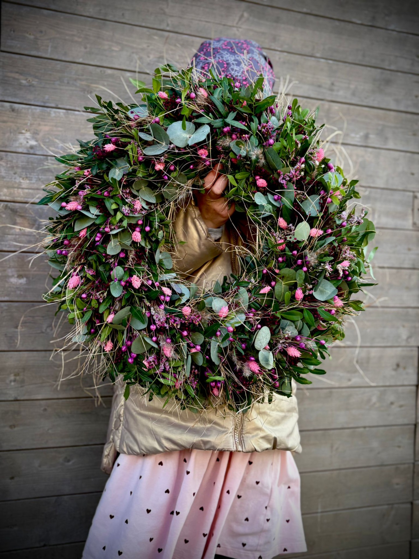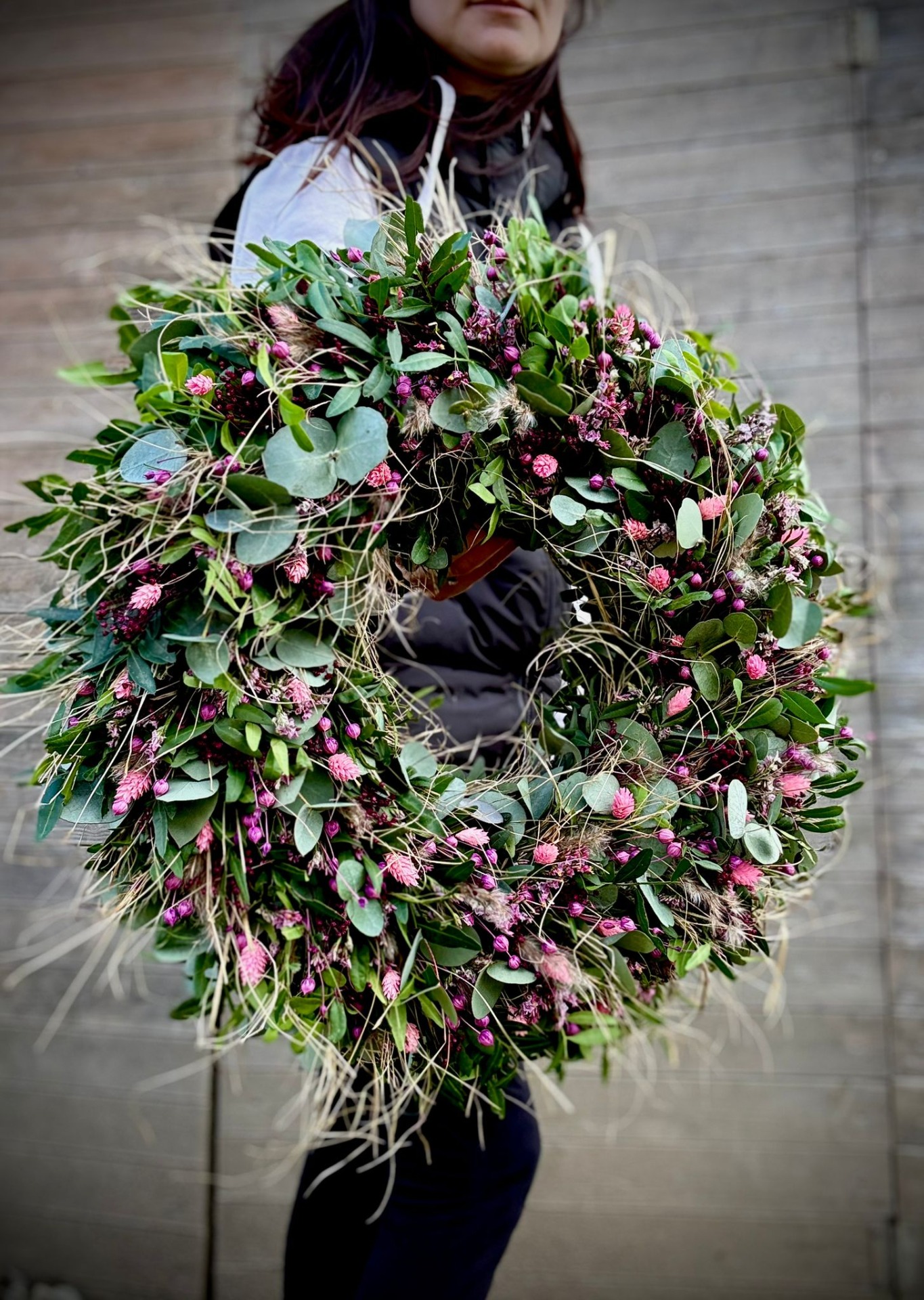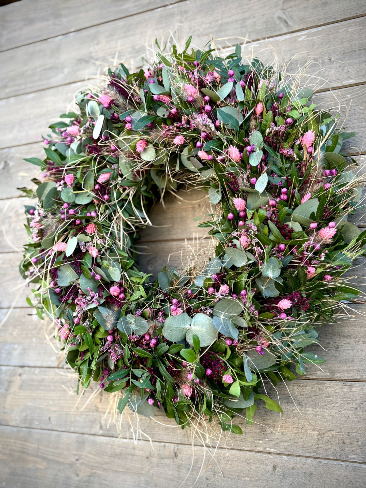 Kombinace různých druhů zeleně, jemného eukalyptu a drobných detailů vytváří přirozeně bohatý, vzdušný a přitom nepřehlédnutelný celek. Díky svému úctyhodnému rozměru 50 cm se stane výraznou dominantou dveří, stěny i interiéru a okamžitě vnese do prostoru osobitou atmosféru.