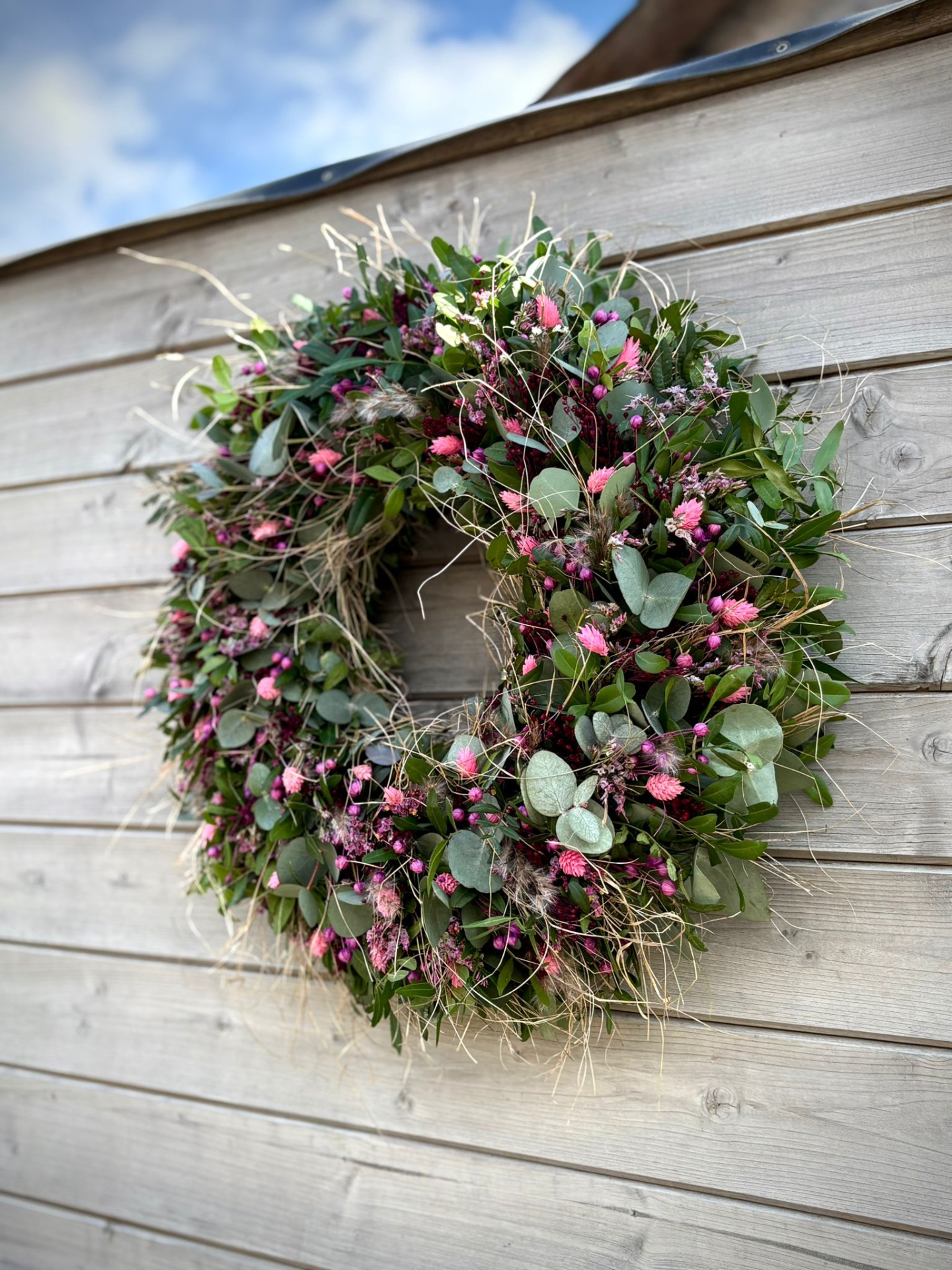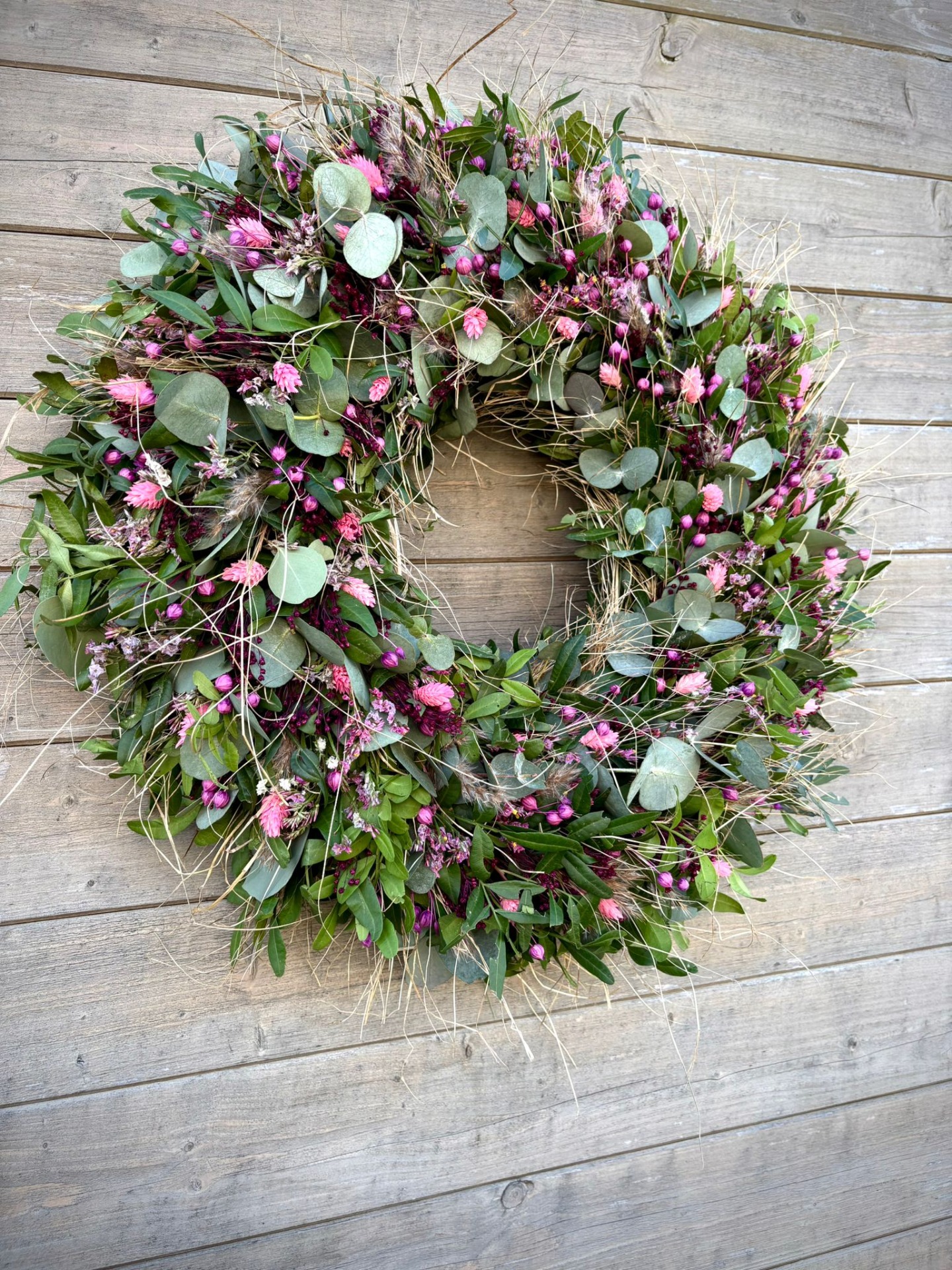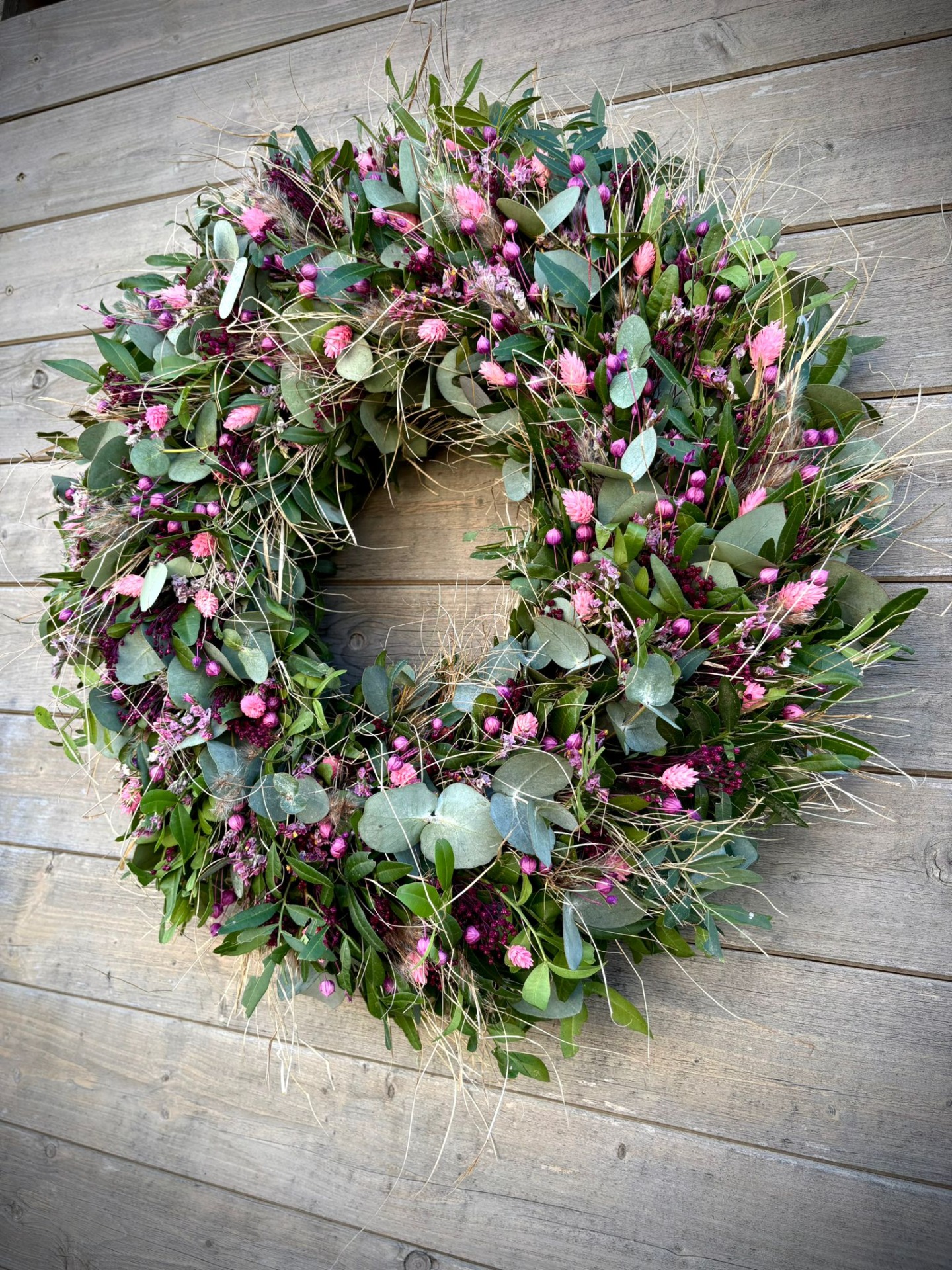 Kombinace různých druhů zeleně, jemného eukalyptu a drobných detailů vytváří přirozeně bohatý, vzdušný a přitom nepřehlédnutelný celek. Díky svému úctyhodnému rozměru 50 cm se stane výraznou dominantou dveří, stěny i interiéru a okamžitě vnese do prostoru osobitou atmosféru.