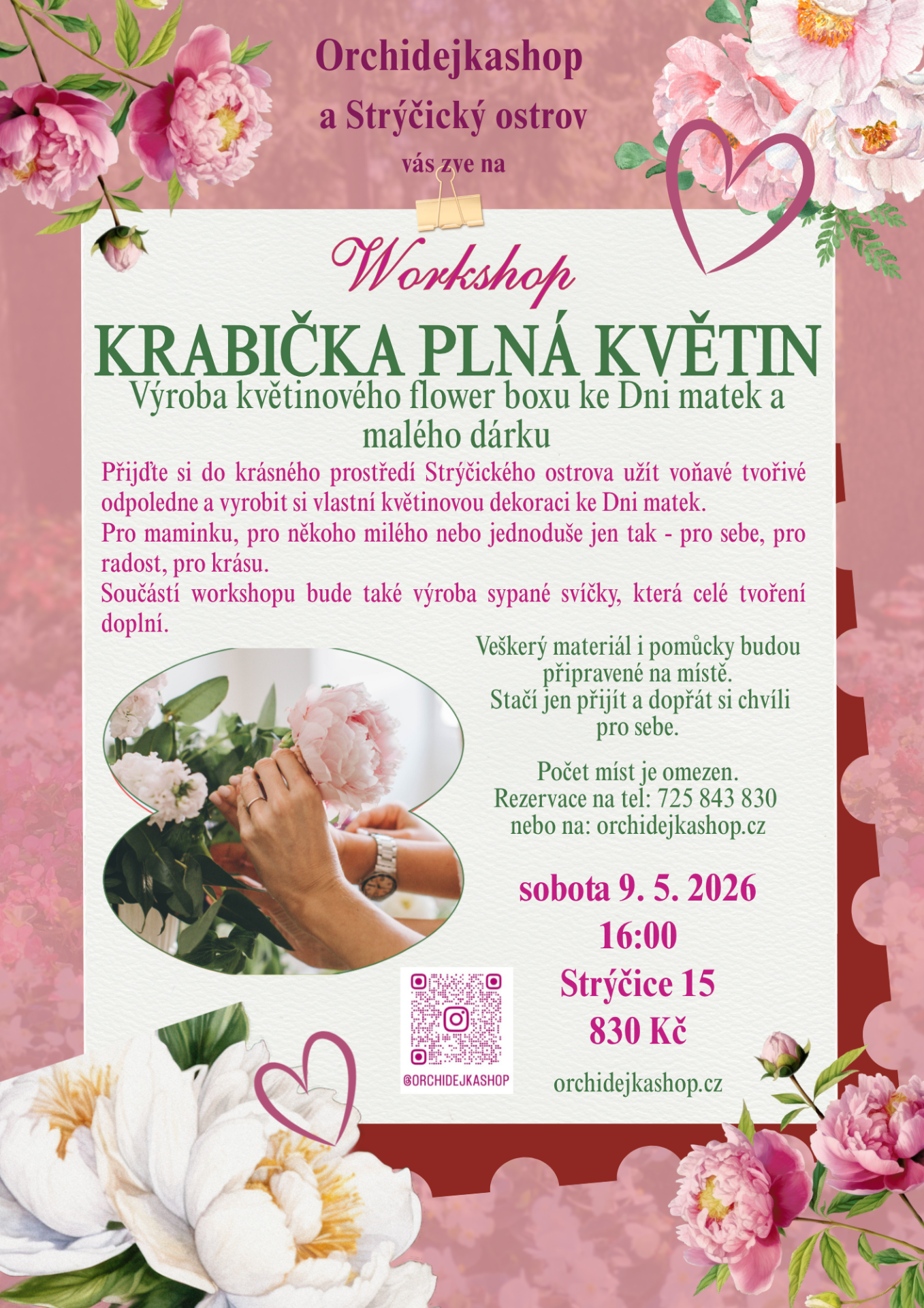 Přijďte si užít voňavé tvořivé odpoledne do krásného prostředí Strýčického ostrova. Na workshopu si vyrobíte krabičku s živými květinami a sypanou svíčku, takže si domů odnesete hned dva originální výrobky. Workshop je laděný ke Dni matek, ale stejně krásně poslouží i jako čas pro sebe, pro radost a tvoření v příjemné atmosféře.
