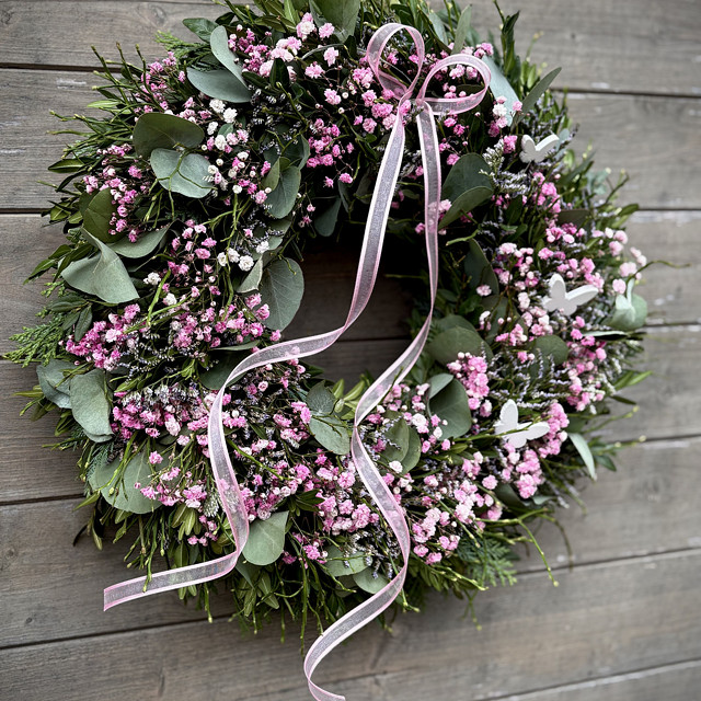 Tento věnec jsem tvořila jako jemný, něžný a radostný kousek, který vnese do domova lehkost a krásu. Základ tvoří bohatá směs zeleně s eukalyptem, kterou jsem doplnila limoniem a něžnou gypsofilou v růžových tónech. Celý věnec jsem dozdobila mašličkou a drobnými motýlky, které mu dodávají hravý a romantický nádech.