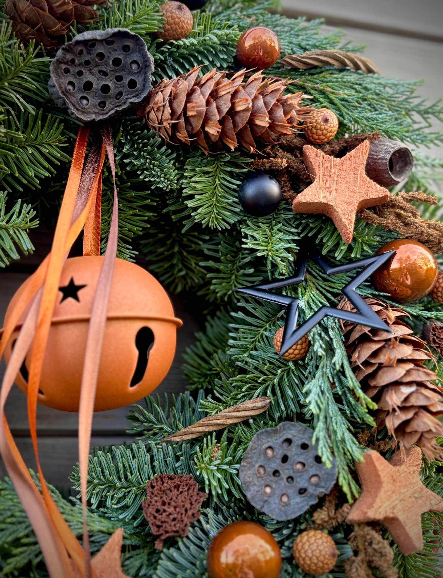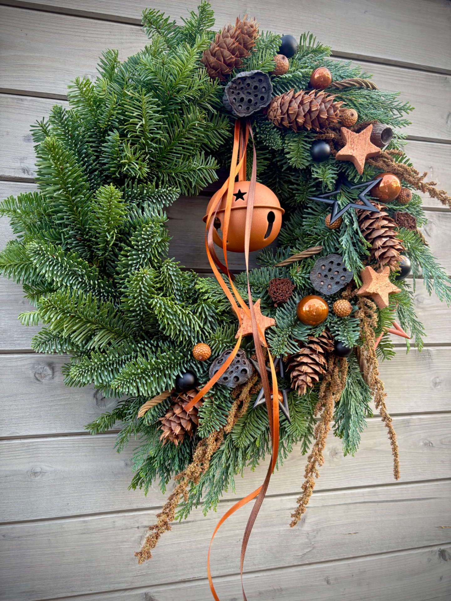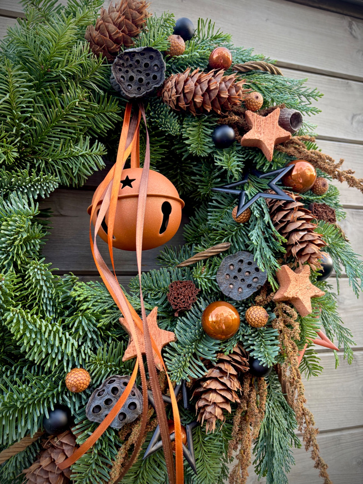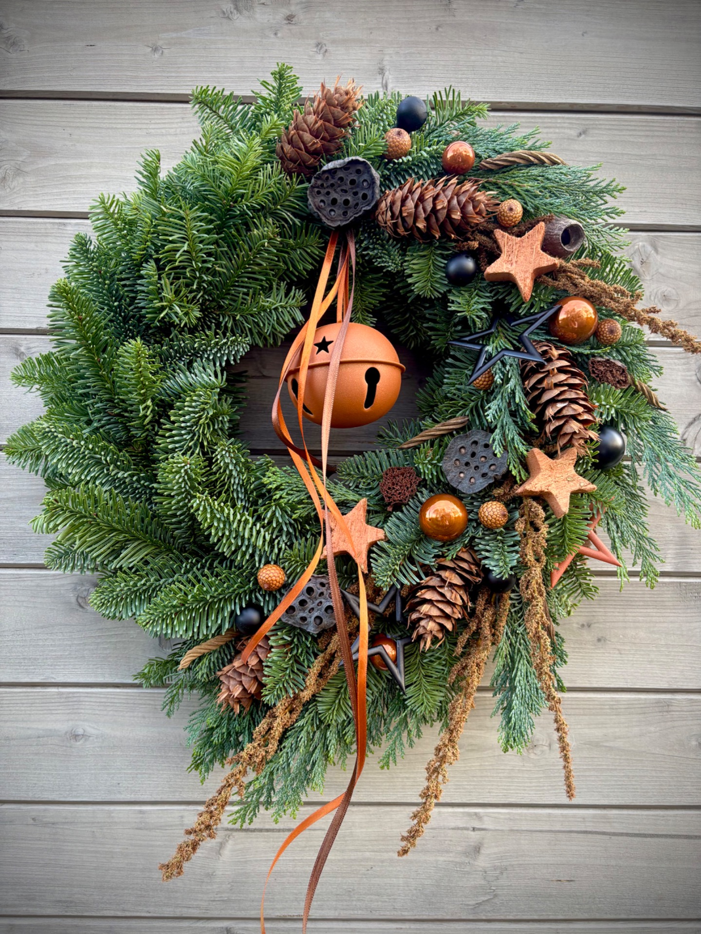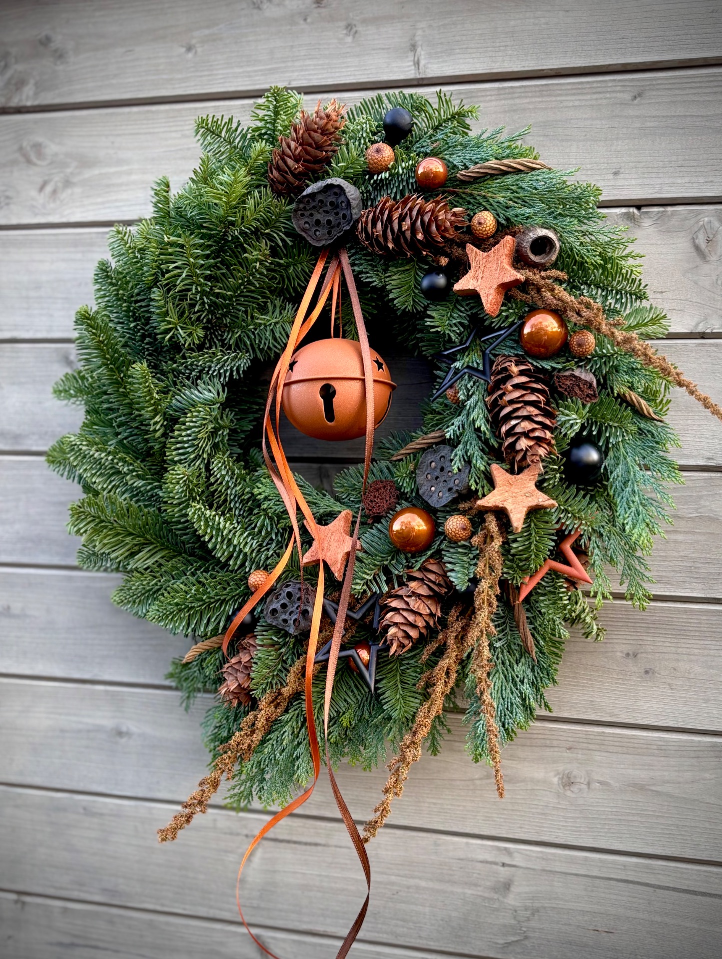 Ručně vázaný věnec z prvotřídní neopadavé jedle Nobilis, která si dlouho drží barvu i jehličí. Věnec působí velmi bohatě a přitom elegantně – v hlavní roli jsou přírodní materiály v kombinaci s moderní měděnou a černou.